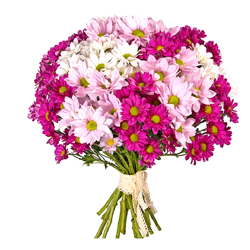 Букет состоит из MIX из 11 веток белой / розовой и красной хризантемы, прозрачная упаковка, атласная лента.